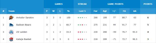 If they both win, Avtodor Saratov and Bakken Bears would both secure top-two finishes in the standings, clinching Play-Off berths. ZZ Leiden either have to beat Bakken Bears or Avtodor Saratov have to lose to Kataja Basket for the Dutch side to remain in the running for a top-two finish. Kataja Basket either have to beat Avtodor Saratov or Bakken Bears have to lose to ZZ Leiden for the Finnish side to remain in the running for a top-two finish. [/unordered]FIBA