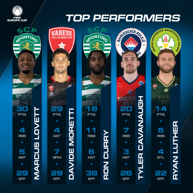 Ron Curry continues to standout for Sporting CP and the guard produced the highest efficiency rating of the round with 38 due to a double-double of 18 points and 11 rebounds in their 103-88 win over Jonava CBet. He also dished out 6 assists in an all-around showcase with 3 blocks and a perfect 8-of-8 shooting night.