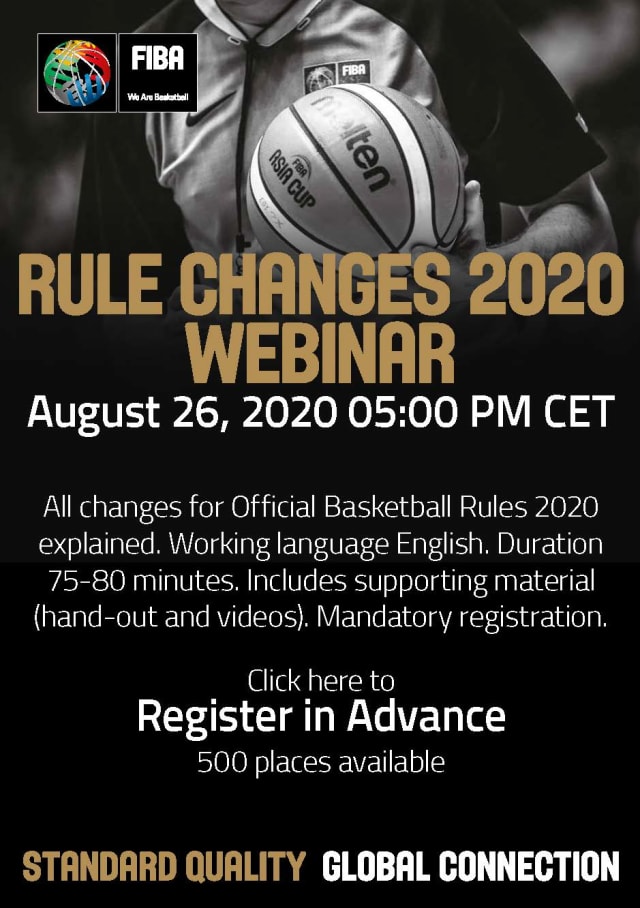 There are 500 places available and anyone wanting to take part must register. The webinar, during which all changes to the Official Basketball Rules 2020 are to be explained, will get underway at 17:00 CET and will run for 75 to 80 minutes.