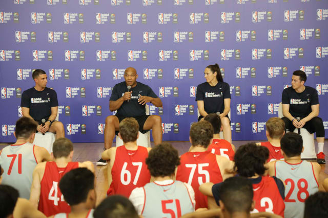 The BWB Asia Camp 2018 campers receive life lesson advice from Minnesota Timberwolves assistant coach Ryan Sauders, Milwaukee Bucks assistant Darvin Ham and former Olympic and WNBA champion Ruth Riley (from left to right).