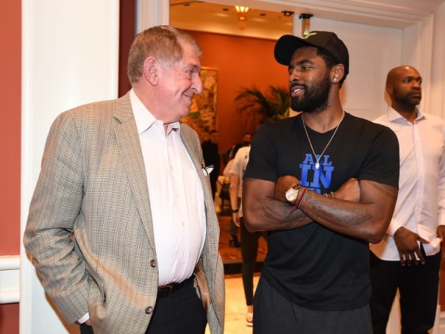 Colangelo sharing a moment with Olympic and World Cup gold medalist Kyrie Irving. (Photo: Andrew Bernstein/NBAE)