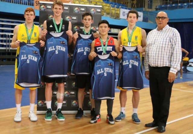FIBA U18 Oceania Championship All-Star Five (from left to right): Angus Glover (AUS), Sam Waardenburg (NZL), Quinn Clinton (NZL), Michael Min (GUM) and Jacob Rigoni (AUS) with FIBA Oceania President Burton Shipley