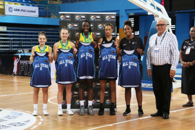 FIBA U18 Women's Oceania Championship 2016 All-Star Five (from left to right): Monique Conti (AUS), Jazmin Shelley (AUS), Ezi Magbegor (AUS), Akiene Reed (NZL) and Losalina Katia (FIJ) with FIBA Oceania President Burton Shipley