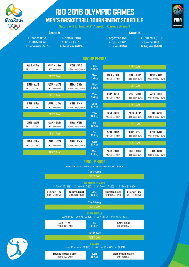 BELGRADE/TURIN/MANILA (Rio 2016 Olympic Games) - The groups and schedule for the Olympic Basketball Tournament at the Rio 2016 Games have been finalised following the conclusion of
