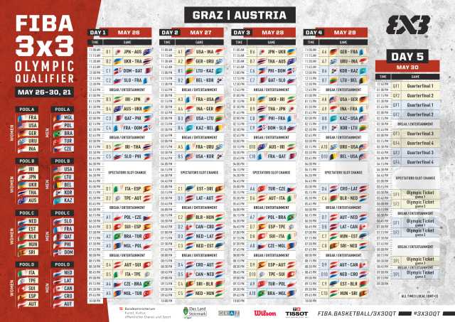 GRAZ (Austria) - From Australia-Japan women to the six "Olympic Ticket" games, FIBA announced the schedule of the 94 matches, which will be played at the FIBA 3x3 Olympic Qualifying Tournament in Graz, Austria on May 26-30, 2021.