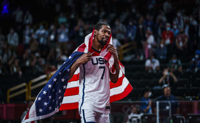 Durant wearing the American flag after claiming his third Olympic gold medal in a row, in Tokyo