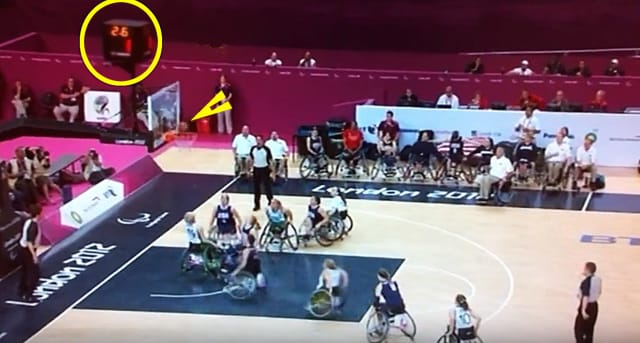 The ball drops through the net on what should have been Alana Nichol's potentially game-winning putback against Australia with 1.9 seconds left in a London 2012 semifinal. Photo capture from IPC video via YouTube.