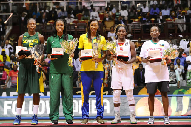 AfroBasket Women 2015 All-Star Five - from left to right: Aya Traore (SEN), Adaora Elonu (NGR), Geraldine Robert (GAB), Ramses Lonlack (CMR) and Deolinda Ngulela (MOZ), Yaoundé (Cameroon), Final, 3 October 2015