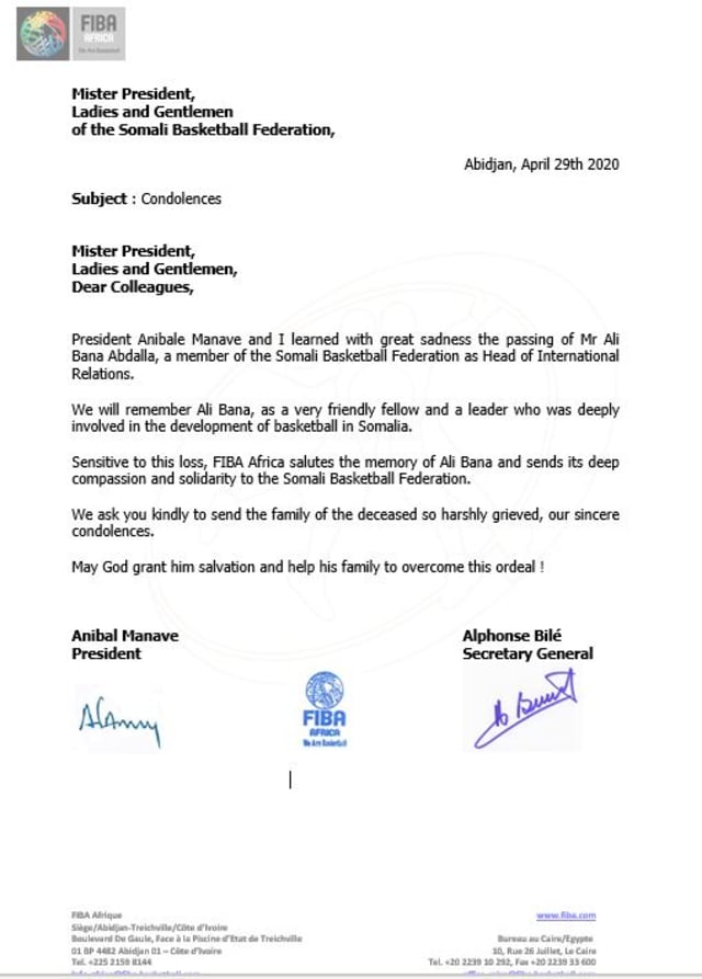 FIBA Africa President Anibal Manave said: "Bana Ali has truly played a key role in the history of Somalia and African basketball. He participated a lot to the growth of the game in Somali and in Zone 5. On behalf of FIBA Africa and the African Basketball Family, I extend my sincere condolences to his family in Somali and United Kingdom."