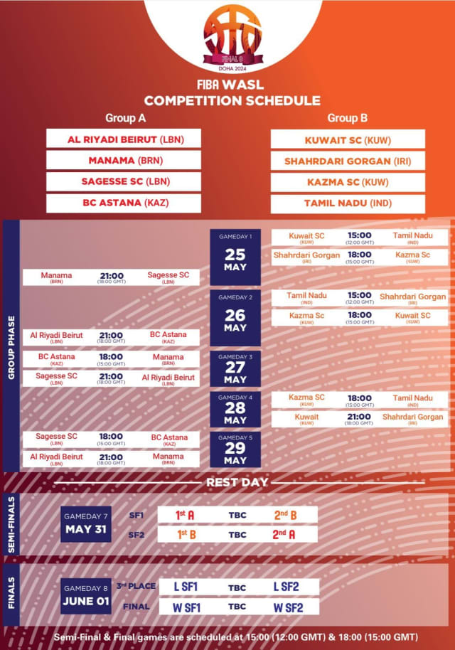 BEIRUT (Lebanon) - The FIBA Regional Office-Asia has confirmed the schedule of the FIBA West Asia Super League (WASL) Final 8 2024 on Tuesday, May 14.