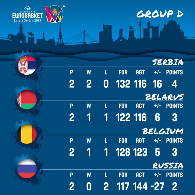 - Russia will be eliminated and there will be a three-way tie for positions 1st, 2nd and 3rd, since Belgium, Belarus and Serbia will all hold 2-1 records. The final standings will be determined by head-to-head records and points differential.  However, in this scenario, Serbia can't take first place in the group.