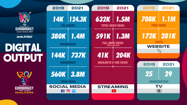 The digital growth was also evident across the competition's dedicated social media channels, with the FIBA Women's EuroBasket Women accounts on Facebook, Instagram and Twitter surpassing a combined total of 124,300 followers. In comparison to 2019, fan engagement grew from 144,000 to 737,000.