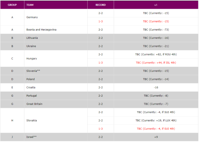 2 | Croatia | 4 | 2 | 2 | 50.0 | 300 | 316 | -16 | 75 | 79 | 6 |