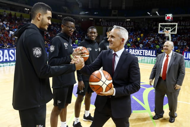 Marcio da Costa Santos, Bruno Henrique Cardoso, Guilherme Carvalho, Daniel Ifedi Ferreira and Matheus Leoni were welcomed on the court during the final of the FIBA Intercontinental Cup's halftime to receive official competition balls from the hands of FIBA President, Mr. Horacio Muratore, and FIBA Americas’ Executive Director, Mr. Carlos Alves.