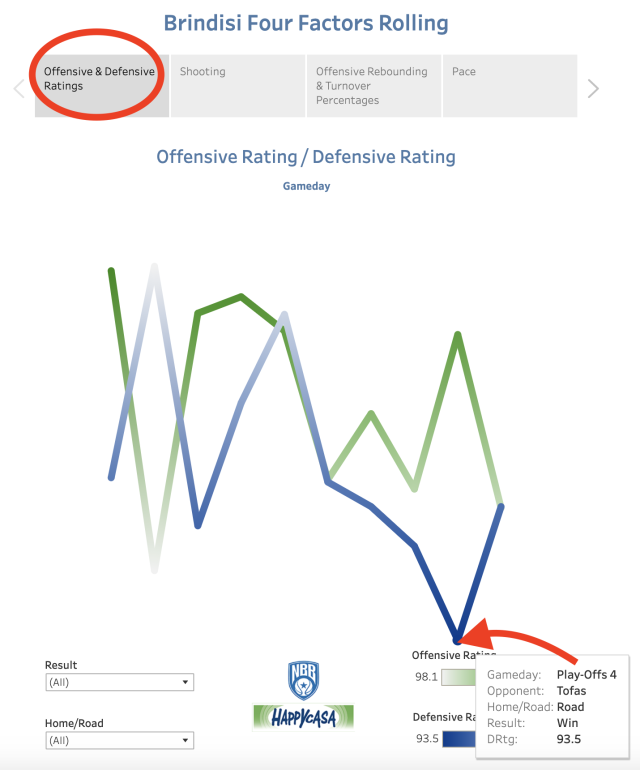Los datos a continuación trazan la temporada de Brindisi a través de la lente de los Cuatro Factores (y el Ritmo) partido a partido. Tienes cuatro pestañas para explorar; Calificaciones ofensivas y defensivas, tiros, rebotes ofensivos y porcentajes de rotación, y ritmo. Cada pestaña tiene filtros para el resultado y la ubicación de los partidos que le permiten ver las victorias contra las derrotas y los partidos en casa contra los visitantes.