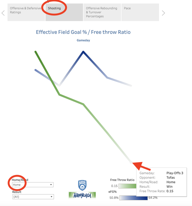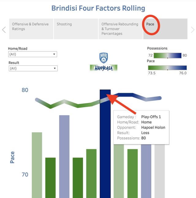 La primera pestaña que se encuentra frente a usted mirando la visualización es el ritmo. Lo que podemos ver instantáneamente es que los Play-Offs han visto un repunte notable en ritmo para Brindisi. Marcado de manera destacada por la primera derrota ante Holon, donde parece que el equipo israelí encontró una manera de apresurar y apresurar a los italianos en su ataque. Si exploramos a lo largo de la línea del promedio móvil, puede ver que Brindisi había estado jugando a 74 posesiones por partido hasta ese momento y el juego de Holon era de 80 posesiones.