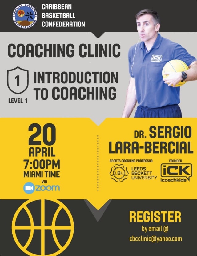 MIAMI (Estados Unidos) - La Confederación de Baloncesto del Caribe (CBC) organizó una Clínica Virtual de Entrenadores para este martes 20 de abril a las 7 pm (ET), con la disertación del Dr. Sergio Lara-Bercial acerca del tema "Introducción al Coaching".