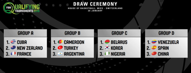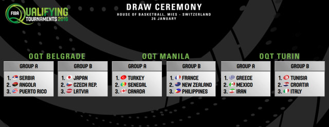 Los ganadores de los tres Torneos de Clasificación Olímpica FIBA (TVO) también avanzarán Rio. En el TCO de Turín estarán Grecia, Irán, México, Croacia, Italia y Túnez, mientras que en el TCO de Belgrado estarán Angola, Puerto Rico, Serbia, la República Checa, Japón y Letonia. Esos TCO se desarrollarán del 4-9 julio. El TCO de Manila se jugará del 5-10 julio y tendrá a Canadá, Senegal, Turquía, Francia, Nueva Zelanda y los anfitriones, Filipinas.