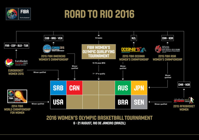 Habrá un torneo de 12 equipos en el Torneo de Clasificación Olímpica Femenina FIBA en Nantes, Francia (13-19 de junio) donde estarán en juego cinco plazas para Rio de Janeiro. Argentina, Belarús, Camerún, China, Cuba, Francia, Corea, Nueva Zelanda, Nigeria, España, Turquía y Venezuela son los equipos que participan.