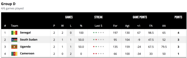 Après avoir perdu par forfait son premier match contre le Soudan du Sud à cause d'un problème en lien avec la COVID-19 au sein de sa délégation, le Cameroun n'a du coup en effet marqué aucun point au classement. Il s'est ensuite incliné contre l'Ouganda lors de son second match (66-80).