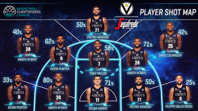 Si vous regardez la carte des joueurs, vous pouvez voir Dejan Kravic en tête, tirant à plus de 70% près du cercle. Notez aussi qu'Amath M'Baye a une réussite incroyablement haute à partir du bloc droit et du coude gauche. Quand le match se joue, le ballon atterrit souvent dans les mains de Kevin Punter mais ne soyez pas surpris de voir Sasa Djordjevic donner le nom du Français, quand il s'agit de scorer dans le périmètre.
