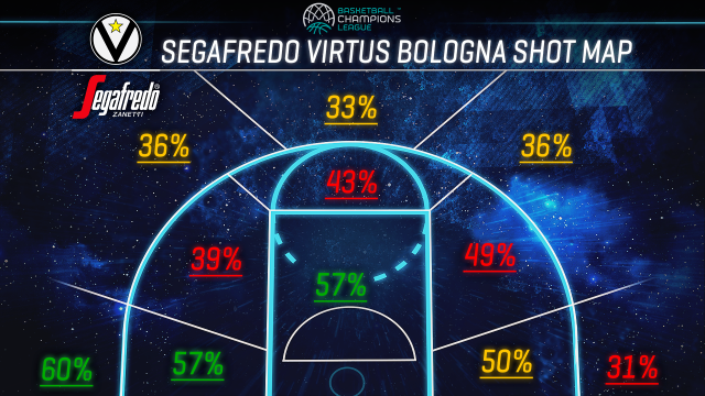 Le profil de tir de cette équipe de Virtus Bologna est sans aucun doute celui d'une équipe qui peut tirer près du cercle quand elle en a besoin. La Virtus prend 57% de ses tirs directement près du cercle. Ce nombre est en fait inférieur à celui de certaines des quatre autres équipes finalistes, mais si l'on considère que les Italiens marquent plus de points dans la peinture que les autres clubs, on comprend que le volume des tirs est beaucoup plus élevé. Le corner droit et le poste bas côté droit sont également des zones chaudes et cette équipe tire à plus d'un point par tir à partir des deux zones poste bas et depuis quatre des cinq zones en dehors de l'arc.