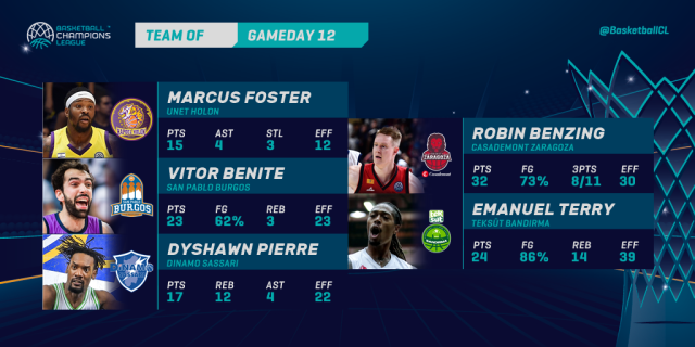 Marcus Foster de UNET Holon, Vitor Benite de San Pablo Burgos, Robin Benzing de Casademont Saragosse, Dyshawn Pierre du Dinamo Sassari et Emanuel Terry de Teksut Bandirma forment l'équipe de la semaine pour la Journée 12 de la Basketball Champions League 2019-20.