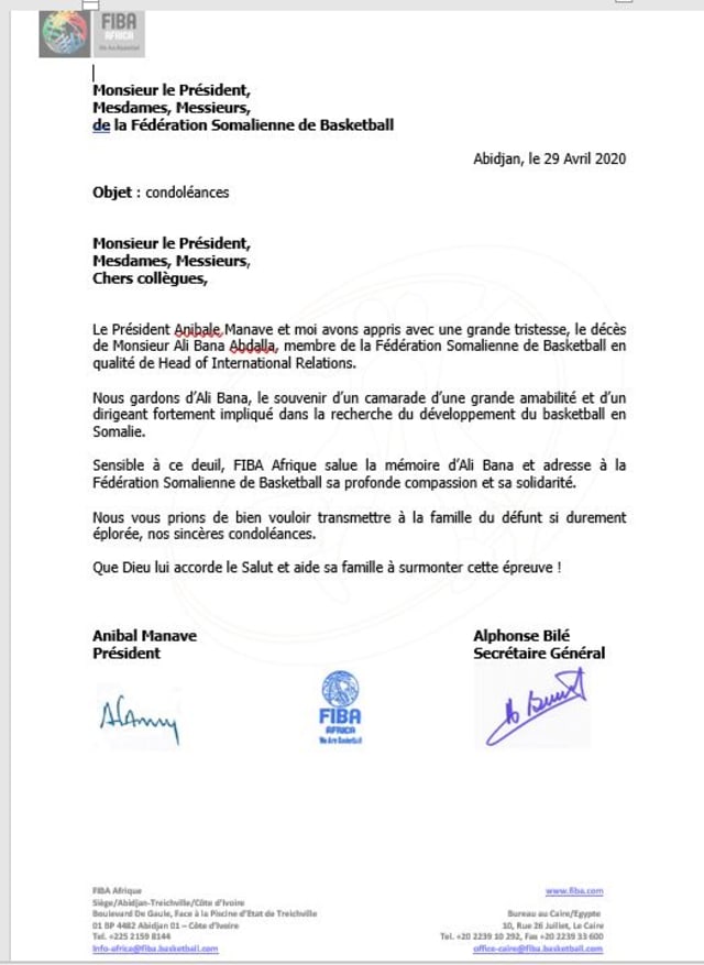 LONDRES (Grande Bretagne) - C'est avec une grande tristesse que FIBA Afrique a annoncé le décès de Bana Ali, directeur des relations internationales de la fédération somalienne de basketball et directeur du marketing de la Zone 5 de FIBA Afrique.